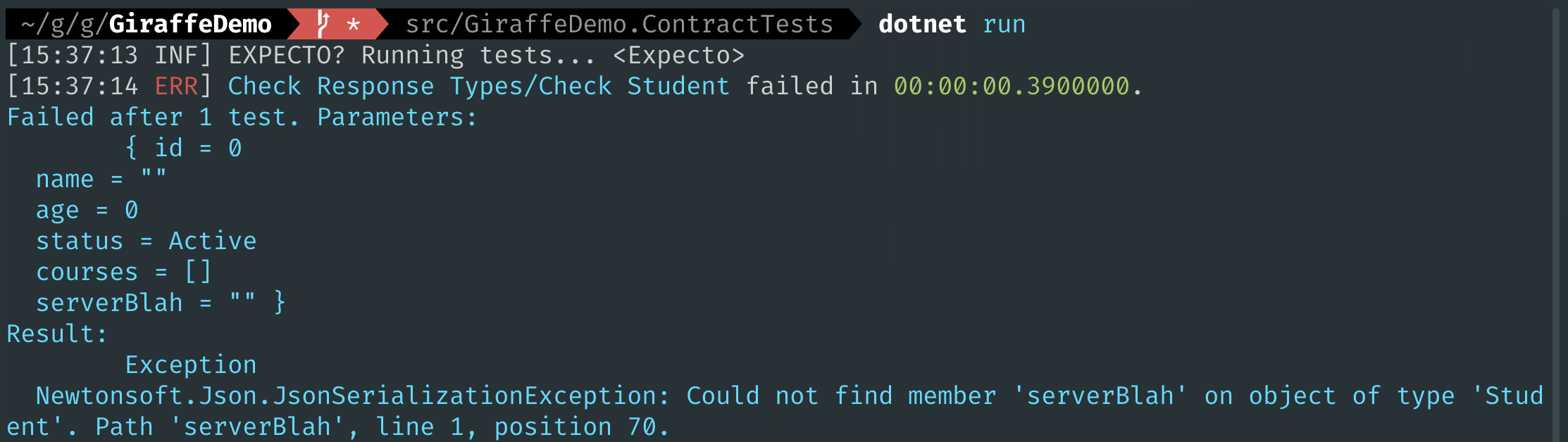 I could write a unit test that serializes an arbitrary web app Student and deserializes it with a client generated Student. Json.NET has a feature that is handy here, and that’s MissingMemberHandling = MissingMemberHandling.Error—with this setting if we have a property in the serialized JSON (and therefore in the web app) and missing from the client type (and therefore the OpenAPI spec file), then it will throw an exception.